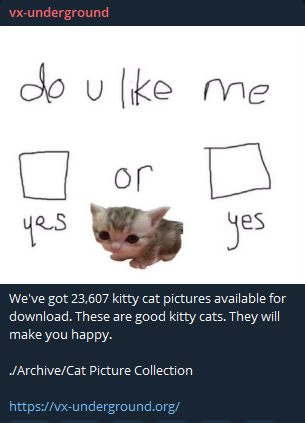 One second they’re dropping fresh ransomware source code and the next it’s just… cats. Like, actual cats. No context.
